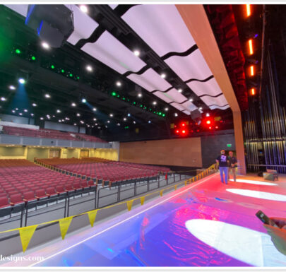 The auditorium was being dramatically enlarged, shaped with curved walls plus adding a balcony. To deal with that condition we developed a custom absorptive diffusive wall treatment. It consists of series of wells of different depths with perforated materials and solid materials, creating a diffuse sound field within the auditorium and generating a relatively low reverberation time for the size of the room. This design criteria was also used for the music spaces to produce similar reverberation curves for their base conditions. That way, when the electronic systems are commissioned, there will be tunings for each space that will mimic each other to the degree that you can mimic a smaller space to a larger space. In addition to the electronic acoustics and physical acoustic designs for this auditorium, AVL Designs Inc. was contracted for stage rigging, theatrical and house lighting, and sound and video in the space.